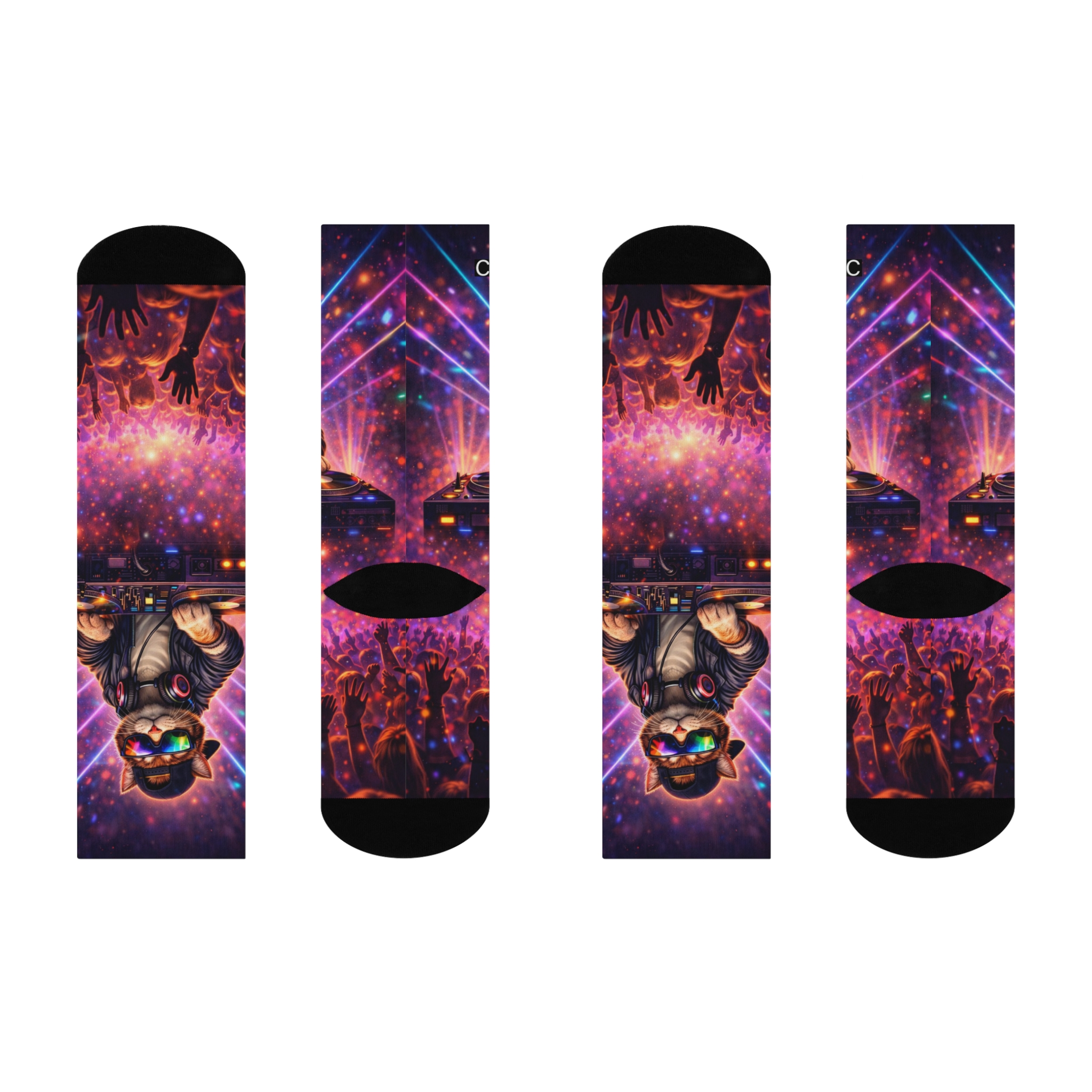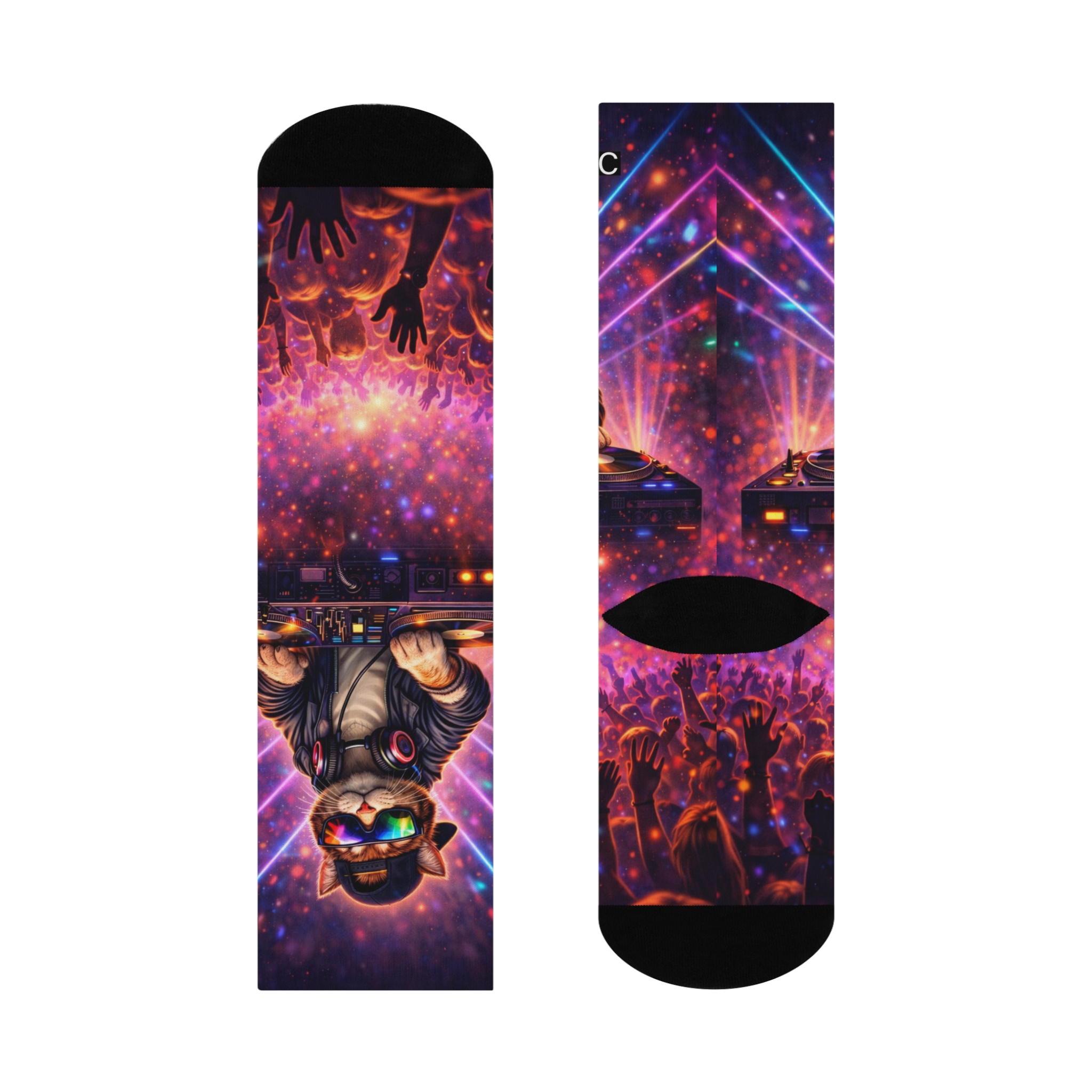 Turn the volume all the way up. These DJ Kitty Socks feature a party-ready cat spinning beats in a cosmic club scene, bringing nonstop rave energy to your feet.